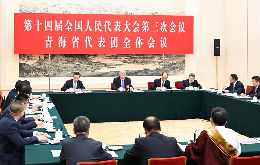 3月7日上午,中共中央政治局常委、中央書記處書記蔡奇來到他所在的青海代表團(tuán),同代表們一起審議。新華社記者 申宏 攝
