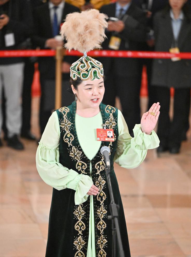 3月11日,第十四屆全國人民代表大會(huì)第三次會(huì)議第三場“代表通道”集中采訪活動(dòng)在北京人民大會(huì)堂舉行。這是全國人大代表卓婭·巴合提接受媒體采訪。新華社記者 胥冰潔 攝
