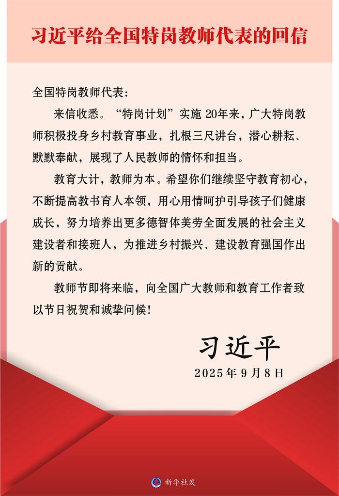 新華社北京9月9日電 在第四十一個(gè)教師節(jié)來臨之際,中共中央總書記、國家主席、中央軍委主席習(xí)近平給全國特崗教師代表回信,提出殷切希望,并向全國廣大教師和教育工作者致以節(jié)日祝賀和誠摯問候。