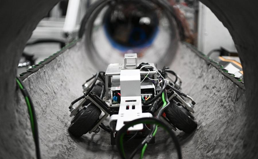 6月25日在廣東省深圳市的廣東省具身智能機(jī)器人創(chuàng)新中心拍攝的管道檢測(cè)機(jī)器人。新華社記者 鄧華 攝