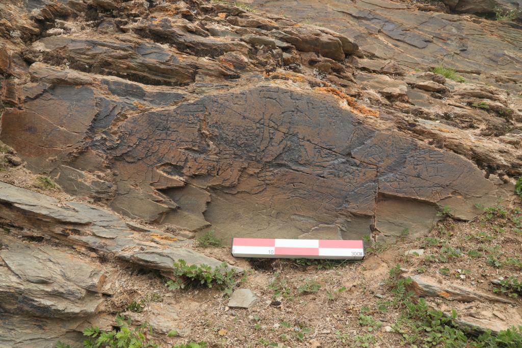文物考古工作者于2023年7月在青海省瑪多縣扎陵湖畔對尕日塘秦刻石進行現(xiàn)場考察時拍攝的該刻石遺跡照片。新華社發(fā)