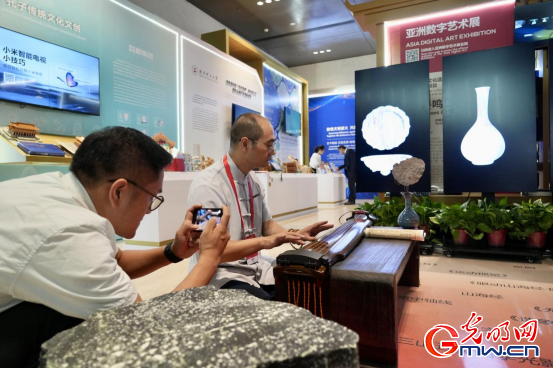工作人員在亞洲數(shù)字藝術展文化遺產(chǎn)古琴與鈞瓷交互項目“鈞彩疊鳴”展位演奏古琴。光明網(wǎng)記者 趙金悅/攝
