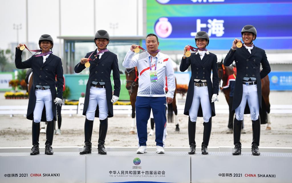 2021年9月16日,冠軍廣東隊(duì)選手黃焯欽(左一)、顧兵(左二)、黃麗興(右二)、譚志勤(右一)和教練員羅東斌(中)在第十四屆全國運(yùn)動(dòng)會(huì)馬術(shù)盛裝舞步團(tuán)體賽頒獎(jiǎng)儀式上。新華社記者 郭程 攝