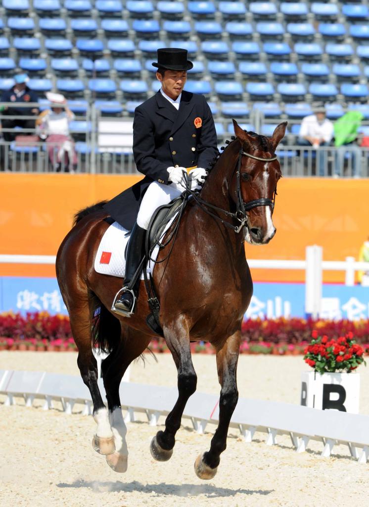 2010年11月14日,中國隊(duì)選手顧兵在第16屆亞運(yùn)會(huì)馬術(shù)盛裝舞步團(tuán)體比賽中。新華社記者 楊宗友 攝