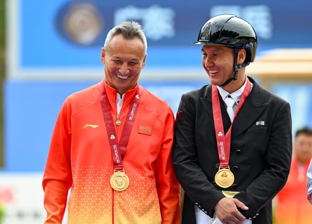 2025年11月12日,冠軍新疆隊(duì)選手劉濤(右)和教練劉忠在第十五屆全國運(yùn)動(dòng)會(huì)馬術(shù)盛裝舞步個(gè)人賽頒獎(jiǎng)儀式上慶祝。新華社記者 馮開華 攝