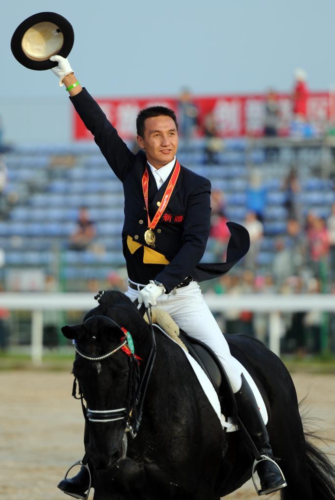 2013年9月8日,劉濤奪得第十二屆全國運(yùn)動(dòng)會(huì)馬術(shù)盛裝舞步個(gè)人冠軍后向觀眾致意。新華社記者 韓瑜慶 攝