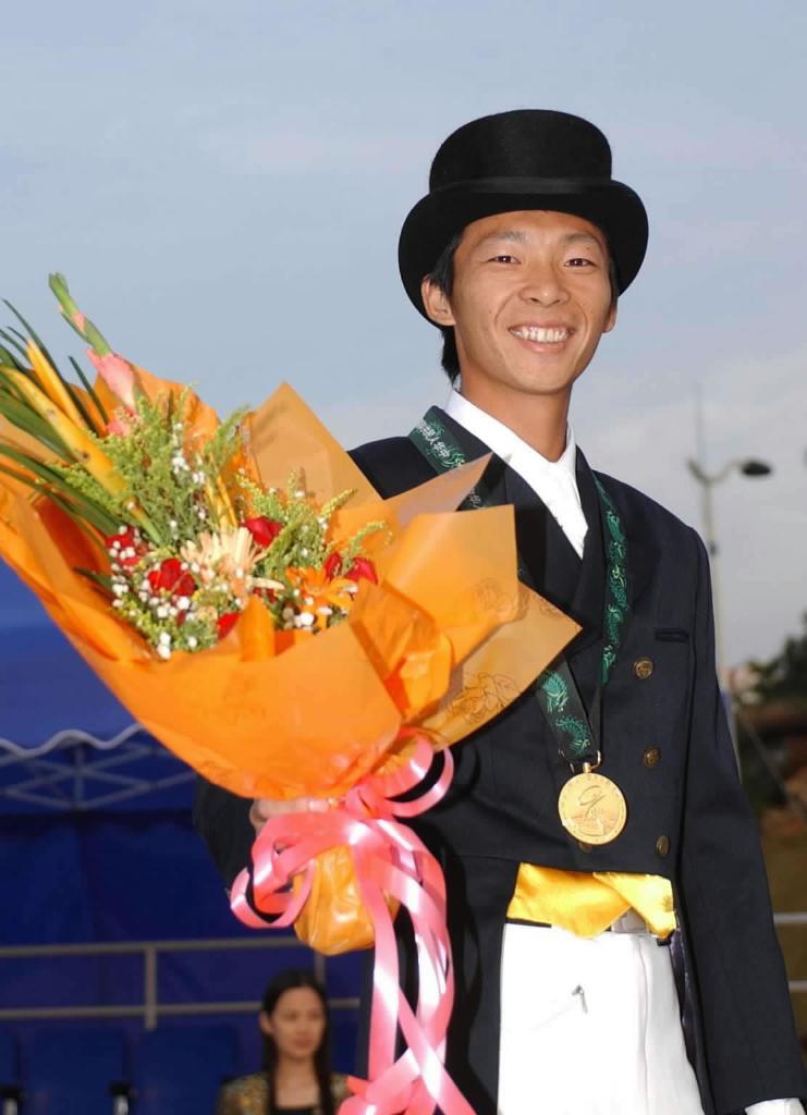 2001年11月6日,黃焯欽在第九屆全國運(yùn)動(dòng)會(huì)馬術(shù)盛裝舞步個(gè)人賽頒獎(jiǎng)儀式上。新華社記者 楊磊 攝