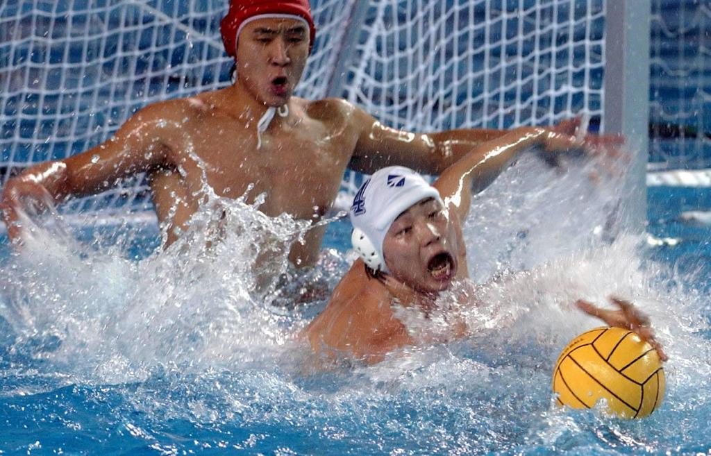 2001年11月20日,余利君(前)在第九屆全國運(yùn)動(dòng)會(huì)男子水球決賽中。上海隊(duì)奪得冠軍。新華社記者 譚熙鵬 攝