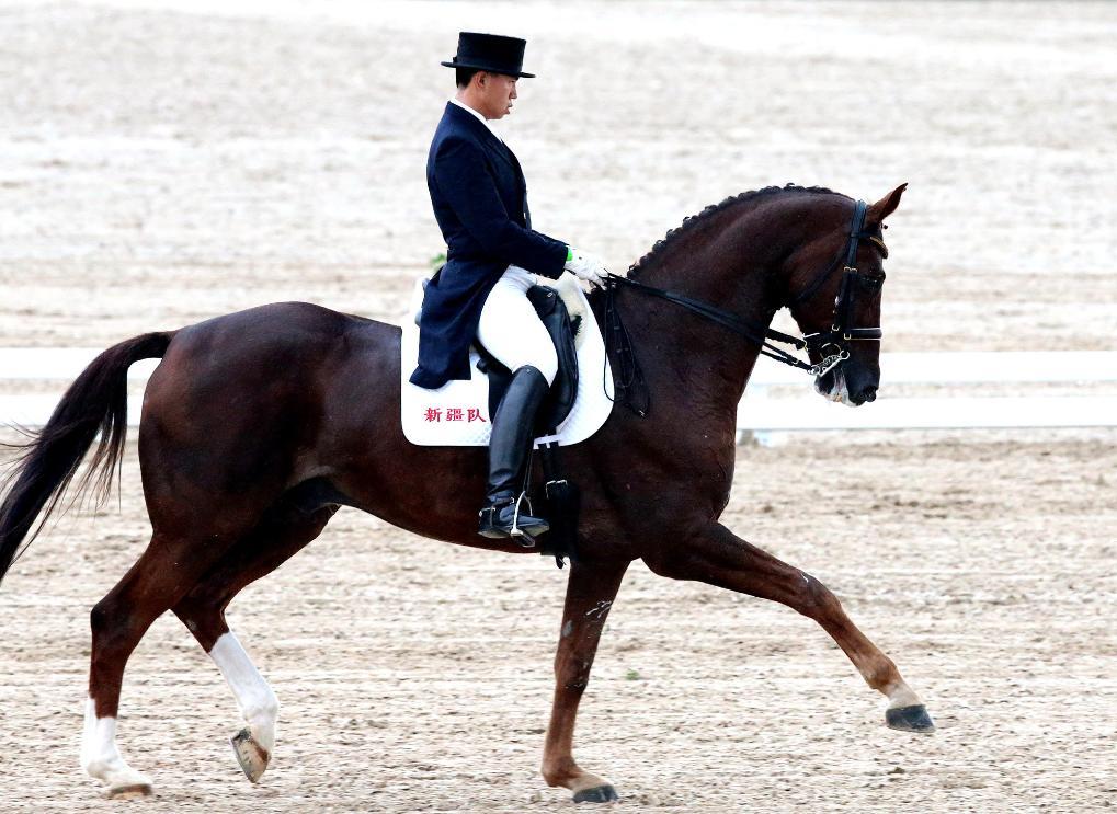 2013年9月6日,新疆隊(duì)選手蘭超在第十二屆全國運(yùn)動(dòng)會(huì)馬術(shù)盛裝舞步團(tuán)體賽中。新華社記者 陳飛 攝