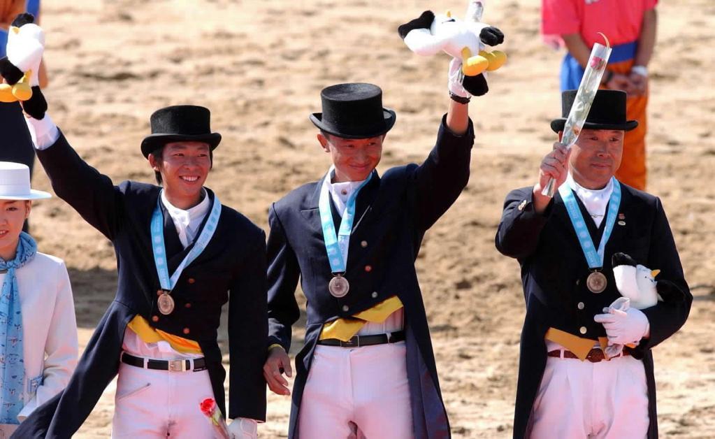 2002年10月8日,中國隊(duì)選手黃焯欽、顧兵、張立軍(從左至右)在頒獎(jiǎng)儀式上。在當(dāng)日進(jìn)行的第14屆亞運(yùn)會(huì)馬術(shù)盛裝舞步團(tuán)體賽中,中國隊(duì)獲得銅牌,實(shí)現(xiàn)了該項(xiàng)目在國際大賽上的歷史性突破。新華社記者 劉大偉 攝