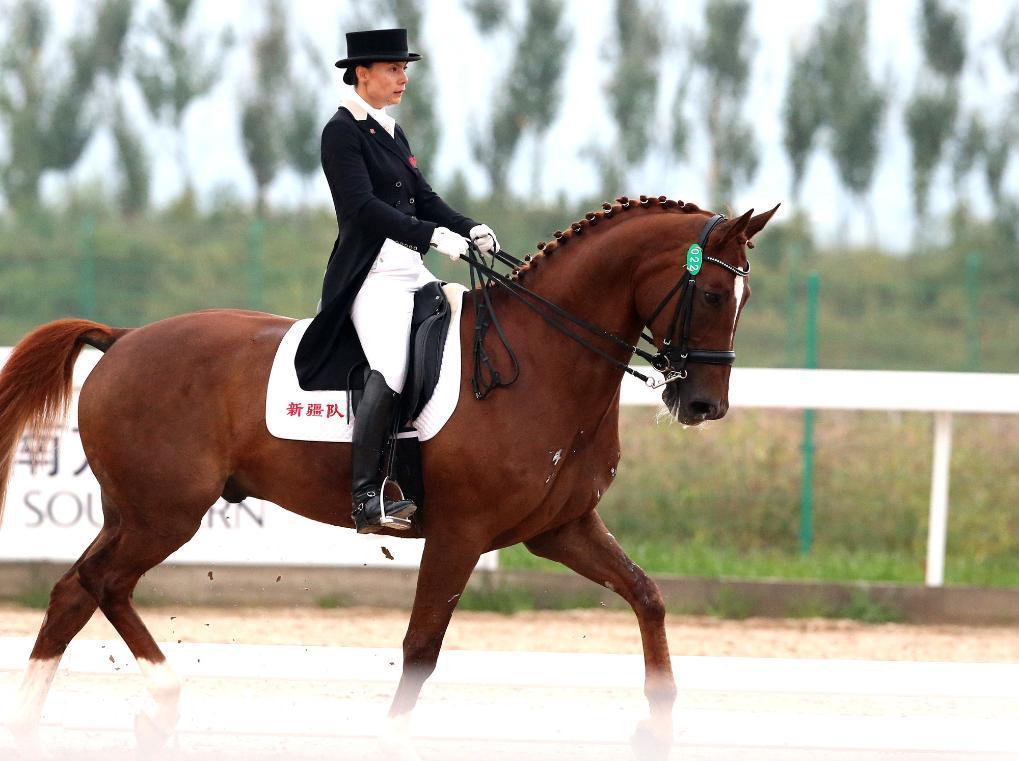 2013年9月6日,新疆隊(duì)選手劉麗娜在第十二屆全運(yùn)會(huì)馬術(shù)盛裝舞步團(tuán)體賽中。新華社記者 陳飛 攝