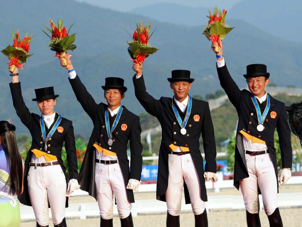 2010年11月14日,中國隊(duì)馬術(shù)選手在頒獎(jiǎng)儀式上。當(dāng)日,在第16屆亞運(yùn)會(huì)馬術(shù)盛裝舞步團(tuán)體比賽中,中國隊(duì)獲得亞軍。新華社記者 楊宗友 攝