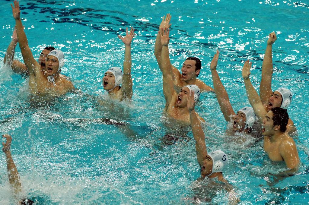 2006年12月14日,中國隊(duì)球員余利君(右三)和隊(duì)友慶祝勝利。當(dāng)日,在多哈亞運(yùn)會(huì)男子水球決賽中,中國隊(duì)以9比8戰(zhàn)勝日本隊(duì),奪得冠軍。 新華社記者 楊世堯 攝