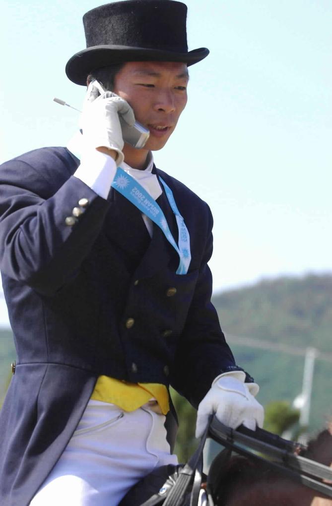 2002年10月8日,中國隊(duì)選手黃焯欽在第14屆亞運(yùn)會(huì)馬術(shù)盛裝舞步團(tuán)體賽后給家里報(bào)喜。新華社記者 劉大偉 攝