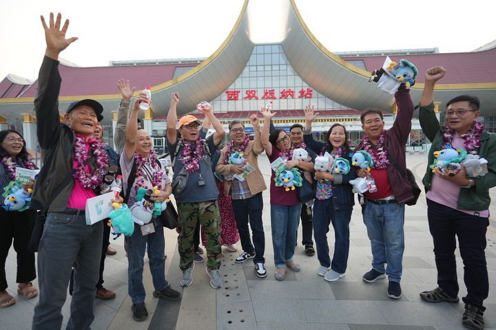 來自泰國和老撾的游客在中老鐵路西雙版納站留影(2025年2月18日攝)。新華社記者 陳欣波 攝