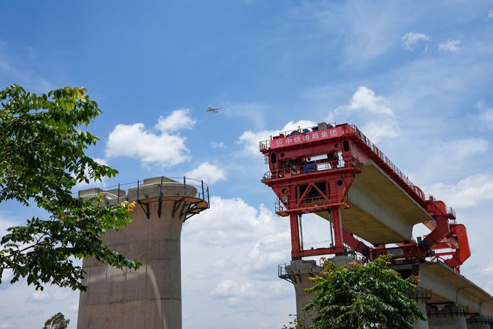 中鐵四局渝昆高鐵昆明樞紐段八家村跨滬昆鐵路特大橋架梁施工現場(2025年5月21日攝)。新華社記者 陳欣波 攝