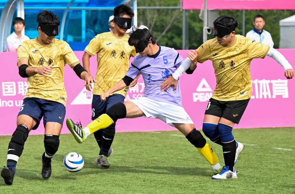 12月14日,在廣州舉行的全國第十二屆殘疾人運(yùn)動會暨第九屆特殊奧林匹克運(yùn)動會盲人足球項(xiàng)目男子組小組賽中,天津隊(duì)1:0戰(zhàn)勝廣東二團(tuán)隊(duì)。圖為天津隊(duì)球員范海林(右二)在比賽中突破。新華社記者 陳浩明 攝