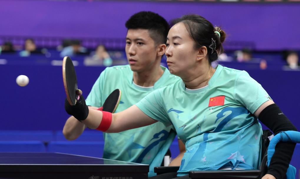 圖為2023年10月26日,毛淋(前)和隊(duì)友翟翔在杭州第4屆亞殘運(yùn)會乒乓球混合雙打4級B組的比賽中。新華社記者 李賀 攝