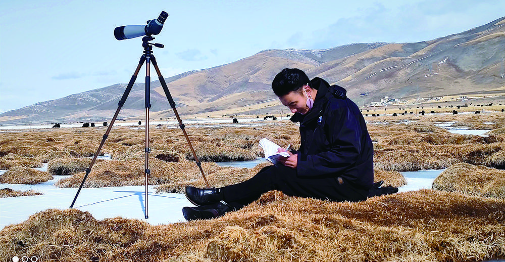 生態(tài)管護(hù)員昂文才仁開展鳥類監(jiān)測(cè)。