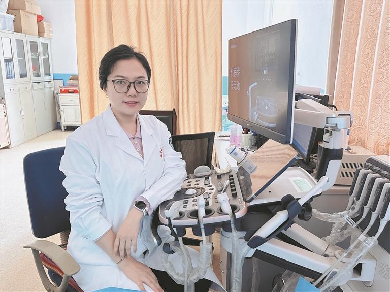 來自清華大學玉泉醫(yī)院超聲科的援青隊員杜晶醫(yī)生調(diào)試儀器中。