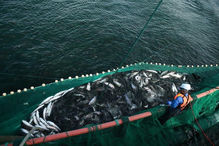 51歲的馮庭貴住在青海省海南藏族自治州共和縣龍羊峽鎮(zhèn),是龍洋知鮮(青海)股份有限公司捕撈隊(duì)隊(duì)長(zhǎng)。“傳統(tǒng)吊網(wǎng)捕撈會(huì)讓虹鱒魚產(chǎn)生更多肌酸,讓虹鱒魚的口感大打折扣。我們現(xiàn)在用吸魚泵連魚帶水直接送入車間,保證了魚的肉質(zhì)鮮嫩?!瘪T庭貴說(shuō)。
