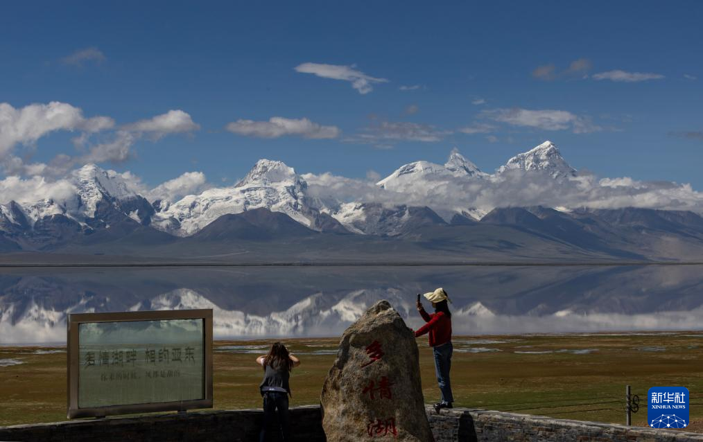 8月1日,游人在多慶錯(cuò)國家濕地公園拍攝卓木拉日雪山。新華社記者 姜帆 攝