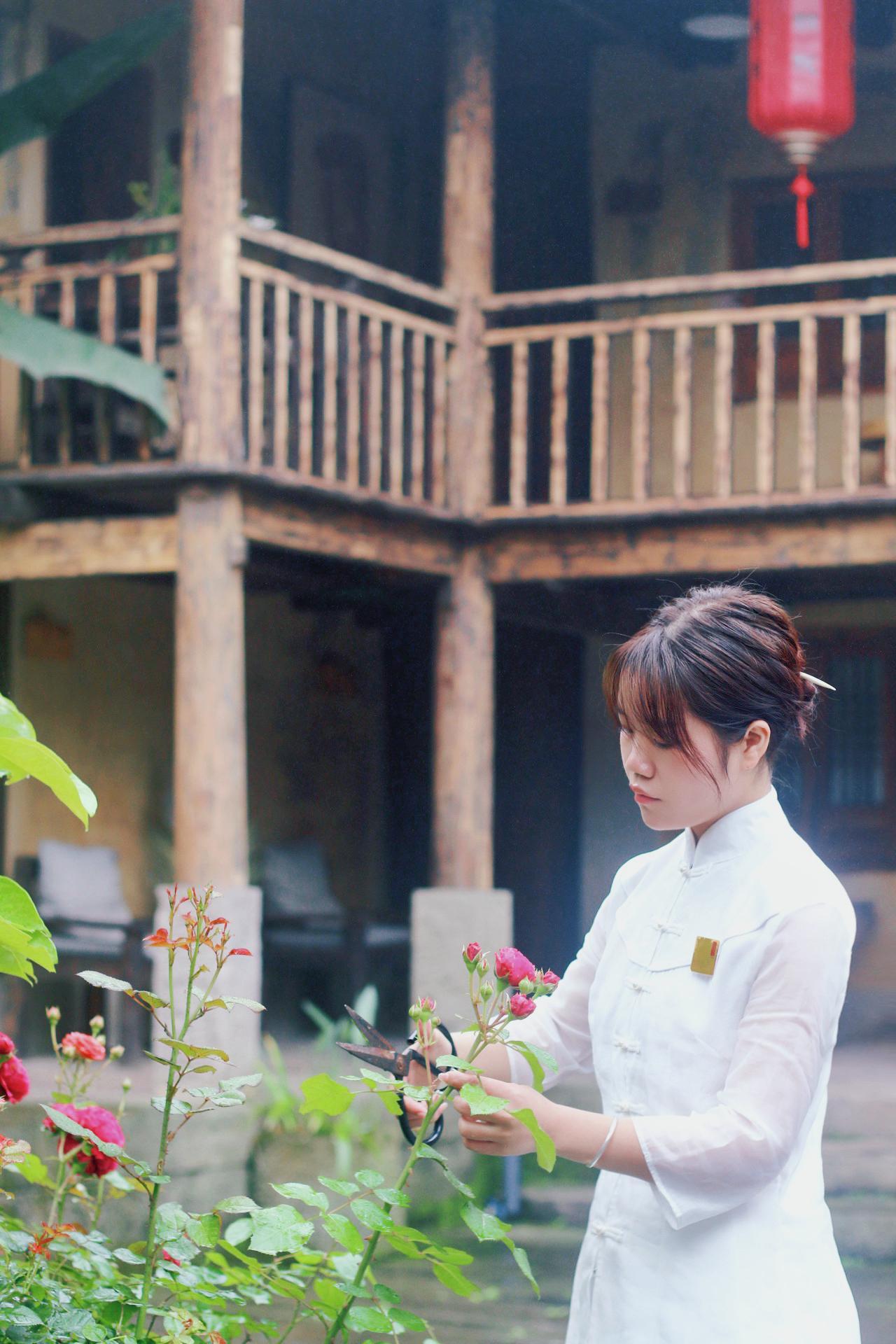 挎上竹籃,拿起剪刀,記者跟隨朱靜踏進(jìn)院子旁的小花園采摘野薔薇等鮮花。隨后,再將摘下來的各色花葉一一插入花瓶,作為每間客房的擺件點(diǎn)綴。
